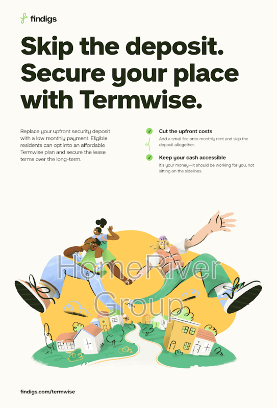 HomeRiver Group has partnered with Termwise to offer an affordable alternative to an upfront cash security deposit. Eligible residents can choose between paying an upfront security deposit or replacing it with an affordable Termwise monthly security deposit waiver fee. For more information, ask your leasing agent or visit: https://www.findigs.com/blog/skip-the-deposit-with-termwise-a-new-way-to-secure-your-rental.