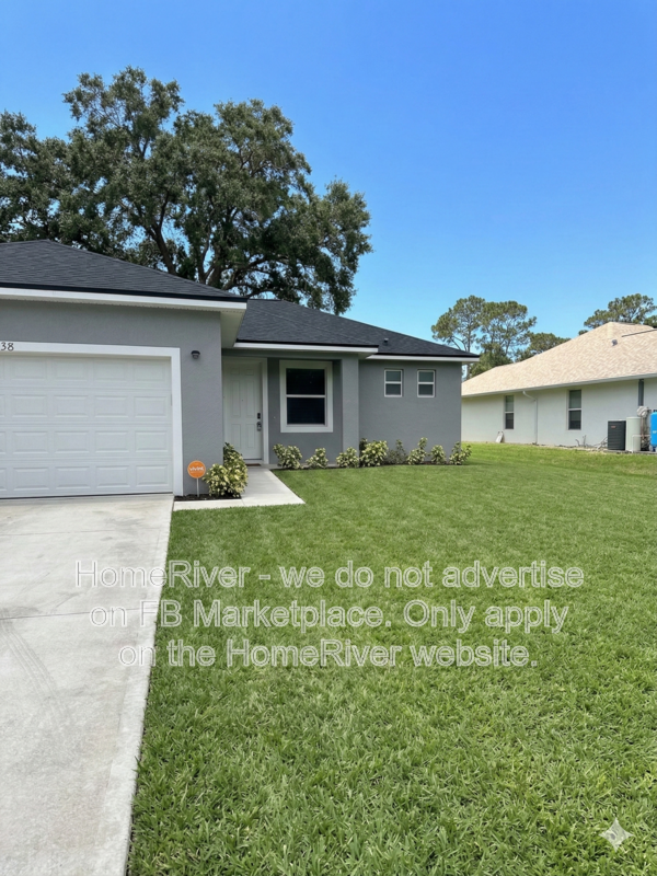 This beautiful 2022-built home at 1138 Westunder St SE, Palm Bay, FL 32909, offers a perfect blend of modern comfort and functional design featuring a pet-friendly, open-concept layout with fresh paint and vinyl flooring throughout. The high ceilings and split bedroom floor plan create a light and airy atmosphere, highlighted by a kitchen equipped with stainless steel appliances, white wood cabinetry, granite countertops, and a convenient breakfast bar. Practicality meets style with a laundry room located off the kitchen providing internal access to the two-car garage, while the master suite boasts a walk-in shower and a dual-sink vanity. Residents can enjoy a serene lifestyle with a large backyard overlooking a peaceful canal, all while benefiting from the home's dedicated water treatment system.
