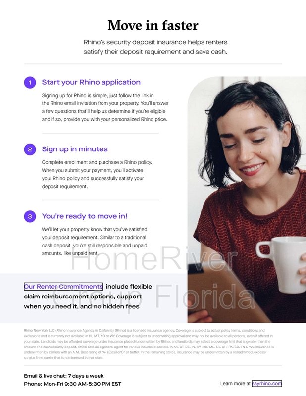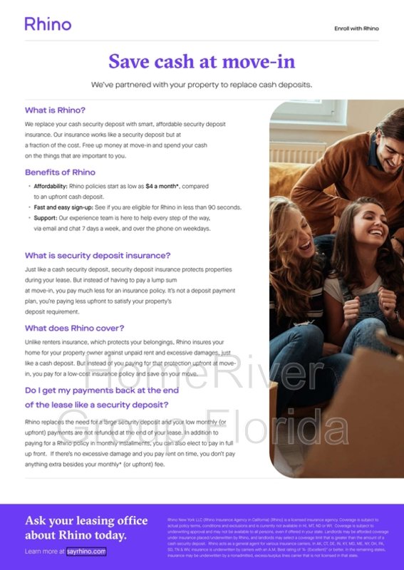 HomeRiver Group has partnered with Rhino to offer an affordable alternative to upfront cash security deposits. Approved residents can choose between paying a security deposit equal to one (1) months rent OR purchase a deposit replacement policy with Rhino at a fraction of the upfront cost. For more information, visit SayRhino.com.