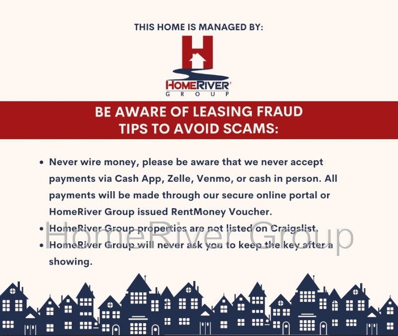 HomeRiver Group does not advertise properties on Craigslist, LetGo, or other classified ad websites. If you suspect one of our properties has been fraudulently listed on these platforms, please notify HomeRiver Group immediately. All payments related to leasing with HomeRiver Group are made exclusively through our website. We never accept wire transfers or payments via Zelle, PayPal, or Cash App. Lease your home safely through www.Homeriver.com or with the assistance of a licensed HomeRiver Group leasing agent. All leasing information contained herein is deemed accurate but not guaranteed. Please note that changes may have occurred since the photographs were taken. Square footage is estimated.